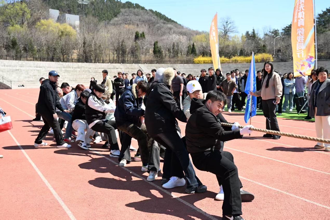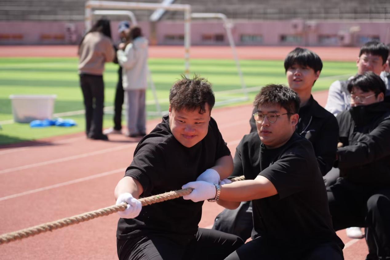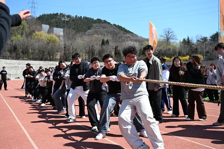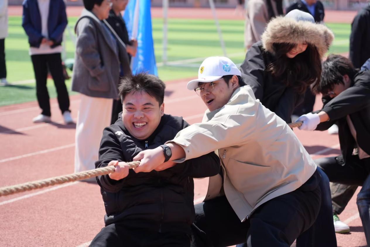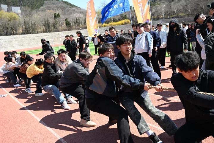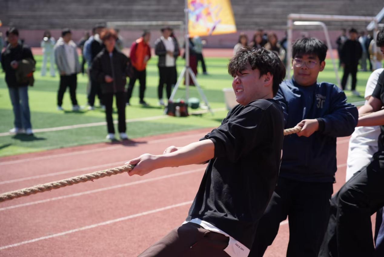 与此同时,拔河比赛1/4决赛也在同步进行。各学院参赛队员们紧握长绳,齐心协力,以顽强的意志展开力量对决。现场呐喊声、助威声此起彼伏,将开幕式氛围推向高潮。